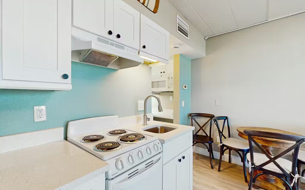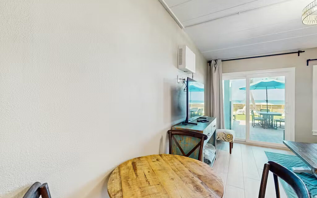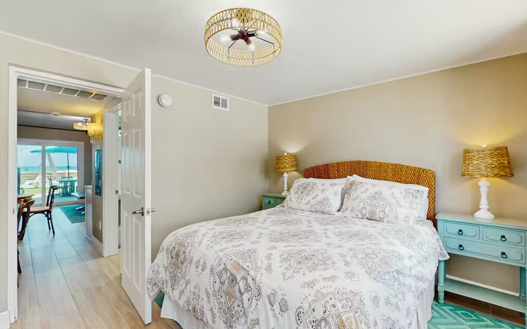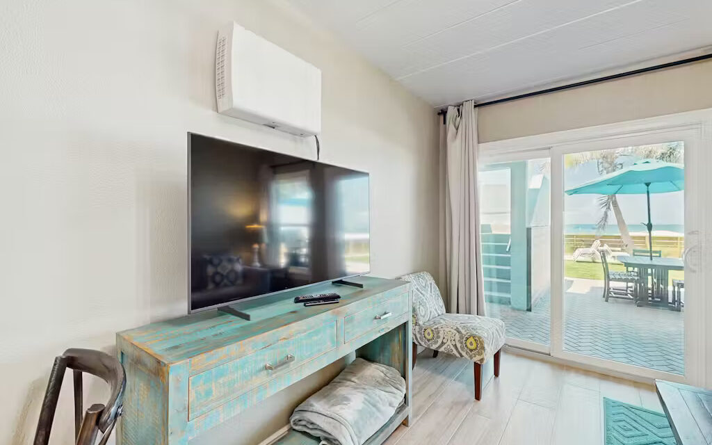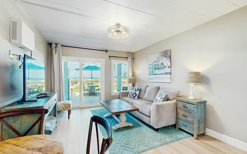Bungalow Beach Place – Unit 3 is located in building 1 on the first floor and offers everything you need for the perfect vacation including free assigned parking, daily 24/7 management availability and 24/7 check in and check out. Unit 3 offers the latest luxury features such as all new appliances, wood floors, granite counter tops, new cabinets and furniture. This beachfront unit is uniquely and tastefully decorated in a coastal theme with brand new flat screen televisions and complimentary state of the art Wi-Fi internet. Air conditioning and heating are also available. This unit sleeps up to 4 people with a sleeper sofa (in the living room) and a queen size bed (in the bedroom) that is fully appointed with a brand new pillow top mattress, dressed in down bedding and ultra-soft bamboo linens. There is also a fully equipped kitchen in unit 3 that includes a refrigerator, stove, oven, microwave, coffee maker, a toaster, dishes, glasses, pots, pans, and silverware.