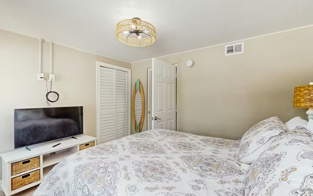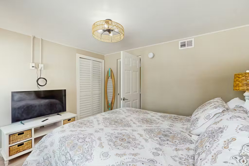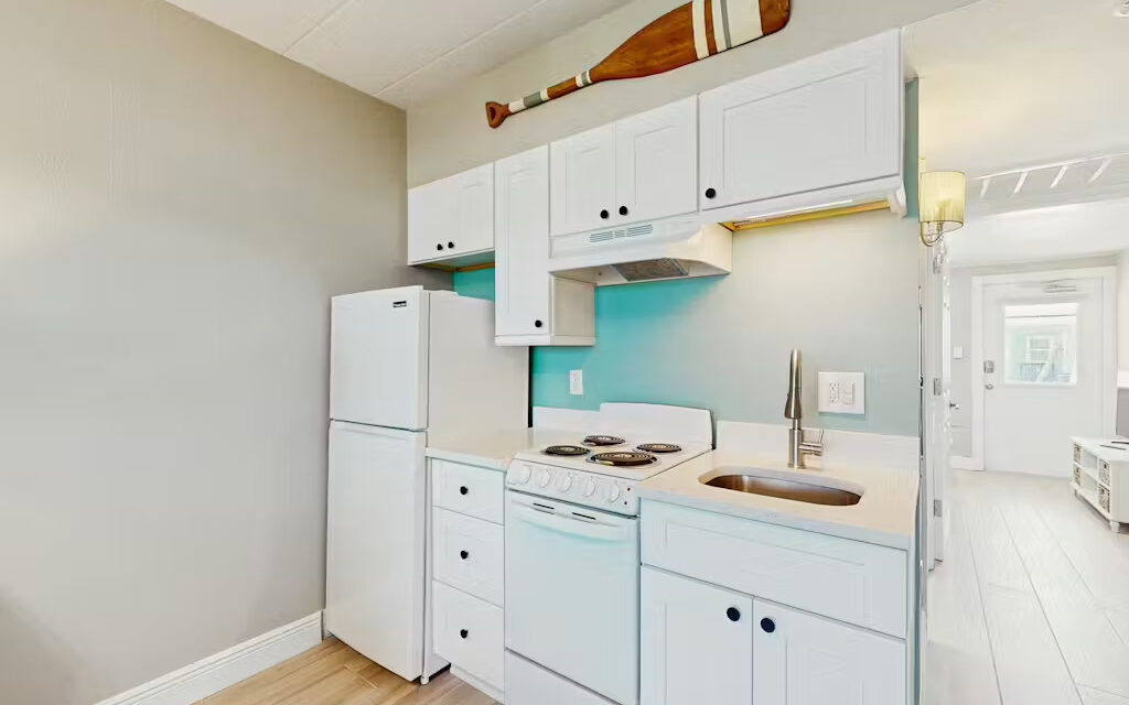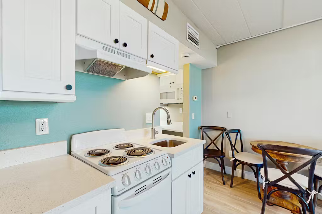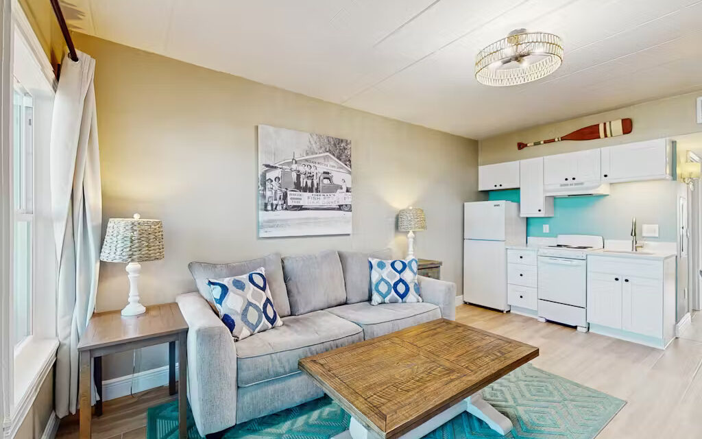 Bungalow Beach Place – Unit 3 is located in building 1 on the first floor and offers everything you need for the perfect vacation including free assigned parking, daily 24/7 management availability and 24/7 check in and check out. Unit 3 offers the latest luxury features such as all new appliances, wood floors, granite counter tops, new cabinets and furniture. This beachfront unit is uniquely and tastefully decorated in a coastal theme with brand new flat screen televisions and complimentary state of the art Wi-Fi internet. Air conditioning and heating are also available. This unit sleeps up to 4 people with a sleeper sofa (in the living room) and a queen size bed (in the bedroom) that is fully appointed with a brand new pillow top mattress, dressed in down bedding and ultra-soft bamboo linens. There is also a fully equipped kitchen in unit 3 that includes a refrigerator, stove, oven, microwave, coffee maker, a toaster, dishes, glasses, pots, pans, and silverware.