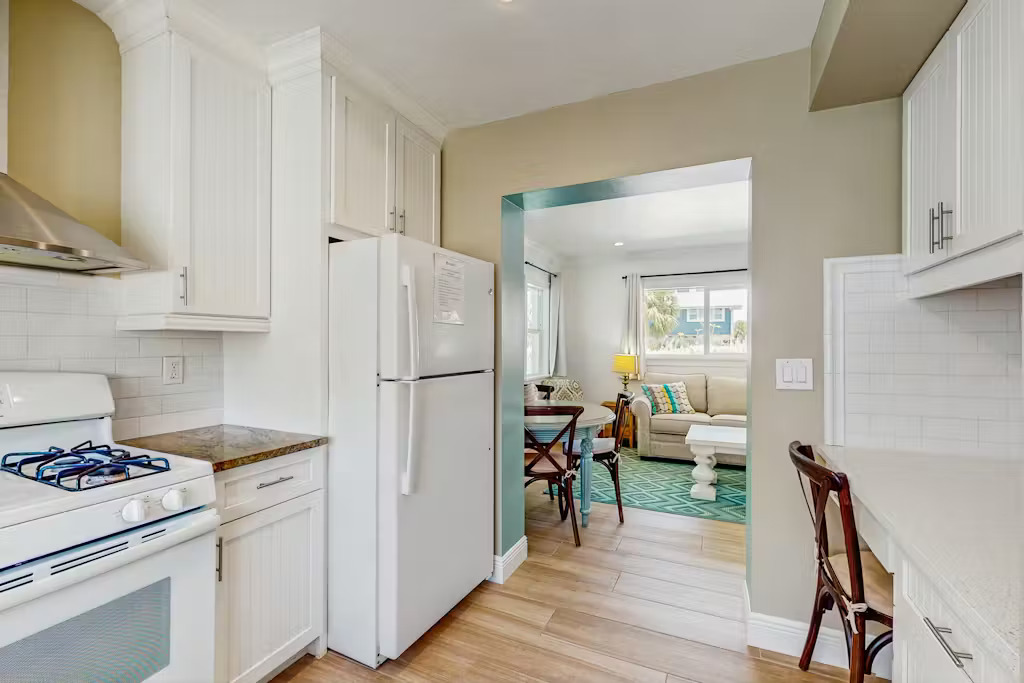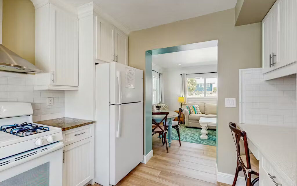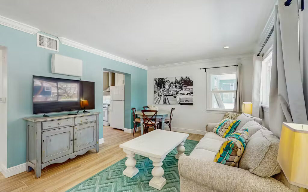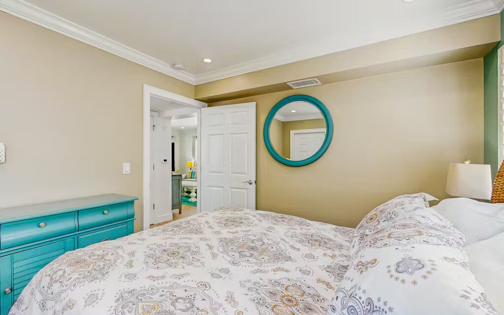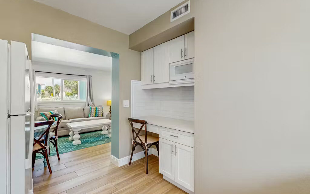 Bungalow Beach Place – Unit 9 is located in building 2 and offers everything you need for the perfect vacation including free assigned parking, daily 24/7 management availability and 24/7 check in and check out. This condo can sleep up to 6 people. It has two bedrooms and one bathroom (located just outside the two bedrooms). Each bedroom is fully appointed with brand new pillow top mattresses dressed in down bedding, ultra-soft bamboo linens, and the finest soft luxury bath towels. Brand new 50″ LED Samsung flat screen smart televisions have been installed in each bedroom. There is a full kitchen with brand new appliances including stove, oven, refrigerator, microwave, coffee maker, toaster, blender, full set of cookware, dishes, glasses and silverware.